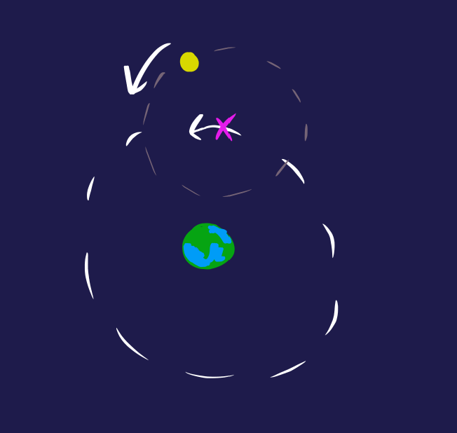 in historical cosmologies, astronomers explained these back-and-forth loops with the concept of the epicycle—an orbit within an orbit. in these geocentric models, the idea was that the luminary itself didn’t really properly orbit the earth—rather, the planet revolves around its own little circle, while that circle’s empty center itself orbits the earth. so, in this model, as the planet swings from one side of its epicycle to the other, it really does change directions.
